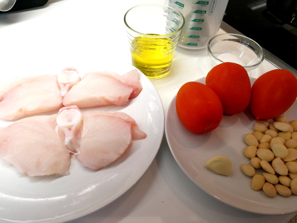 Paso 2. Se trituran todos los ingredientes, almendras, tomate y ajo, con una varilla eléctrica y se incorporan al rape.