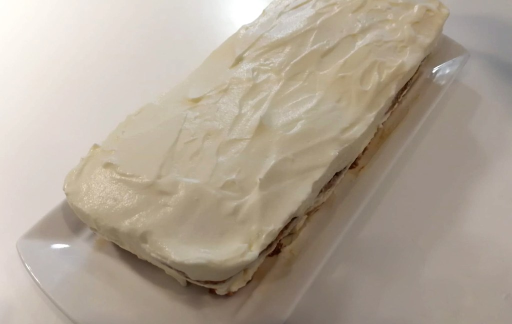 Paso 3. Con cuidado, se tomara crema y se distribuirá uniformemente por encima de los bizcochos. Nuevamente, encima se hará una nueva capa de bizcochos y se cubrirá de crema, así hasta tres veces (3 capas de bizcocho y 3 de crema. Naturalmente habremos acabado con una capa de crema de queso.