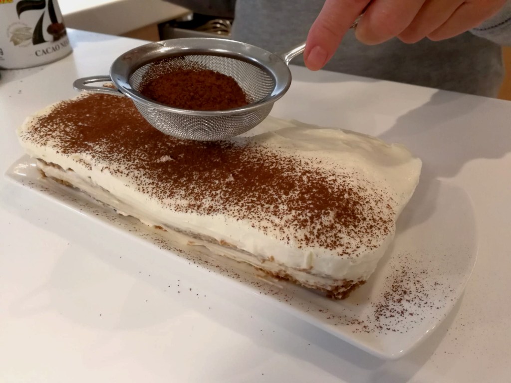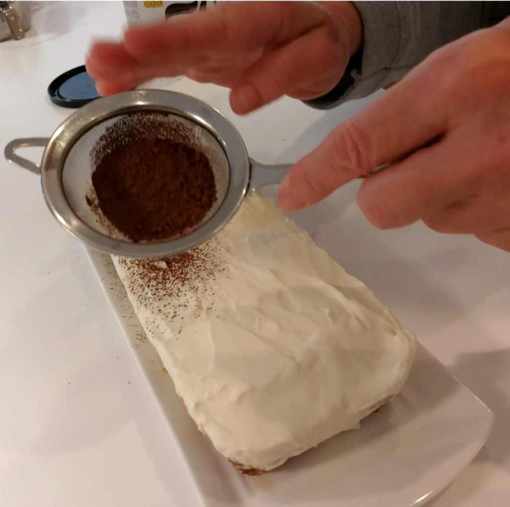 Paso 4. Se moverá suavemente el molde para ayudar a asentar la crea y obtener una cobertura lo más plana y homogénea posible. A continuación tomaremos el cacao y lo pondremos en un colador de cedazo que nos ayudará a espolvorear uniformemente la superficie del postre.