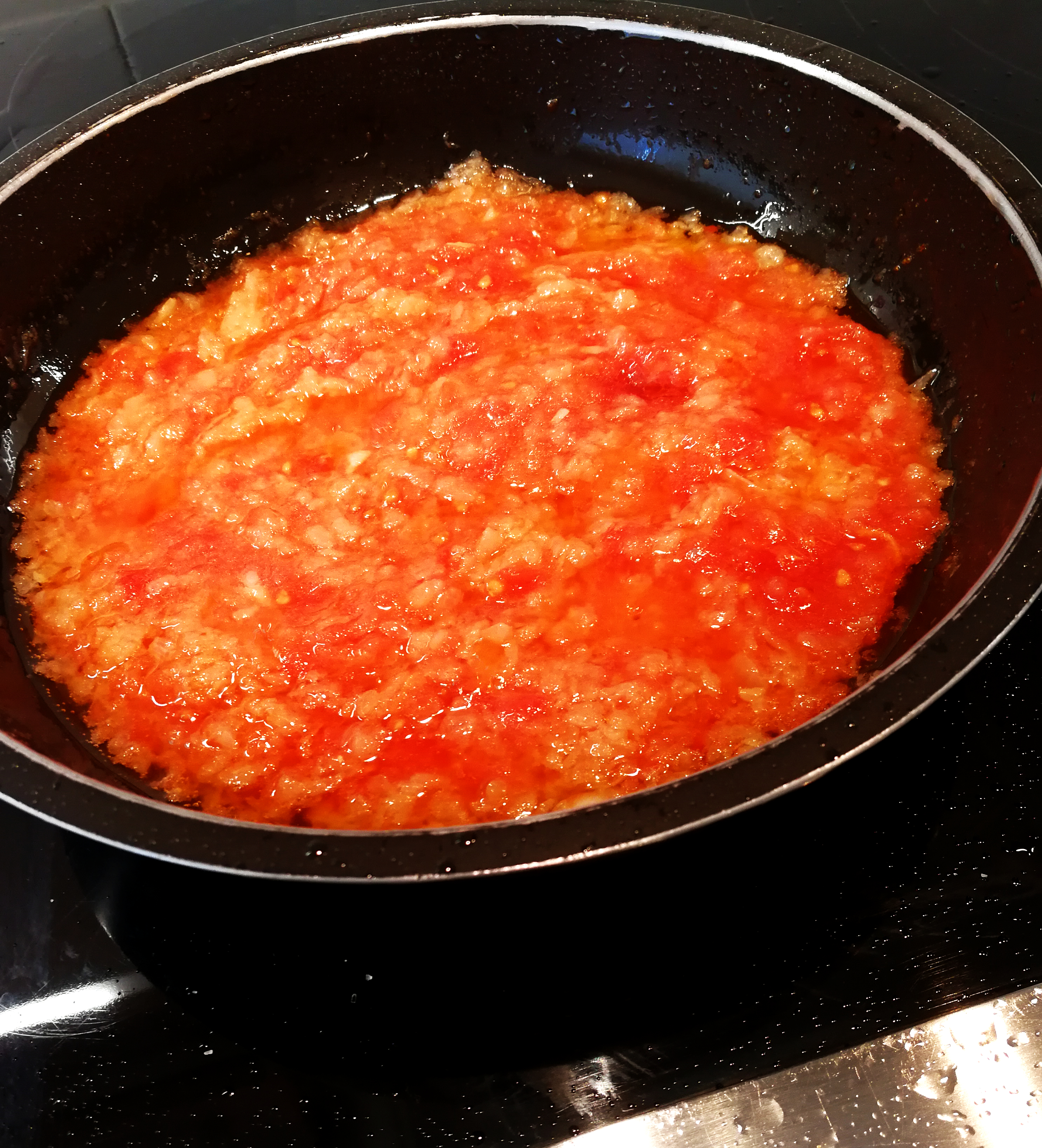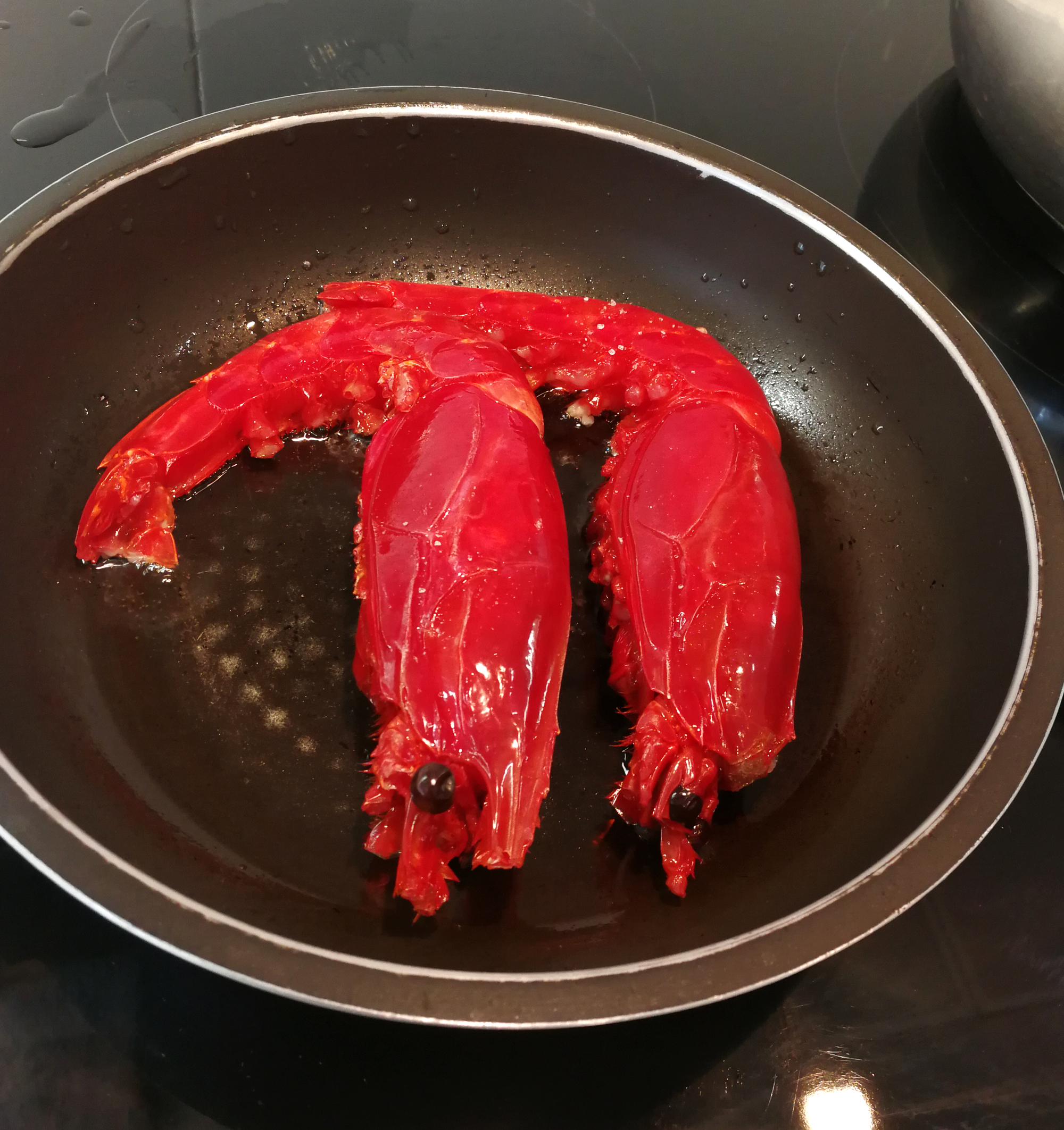 Paso 3. Aparte se pone aceite en una sartén y se fríen ligeramente los carabineros y se reservan en un plato. En el mismo aceite se fríe la cebolla rallada a baja temperatura y cuando esté ponchada se le añade el tomate y antes de apartarlo sofrito se le añade una cucharadita de pimentón.