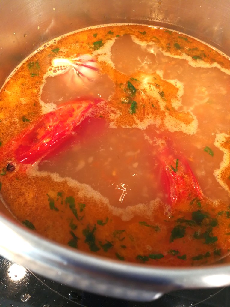Paso 4. El sofrito se añade a la olla que contiene las verdinas. Se separa la cabeza de los carabineros y se introduce también en la olla junto con la cabeza de ajos, sal y una pizca de pimienta. Se deja cocer una media hora más o hasta que estén blandas las alubias.