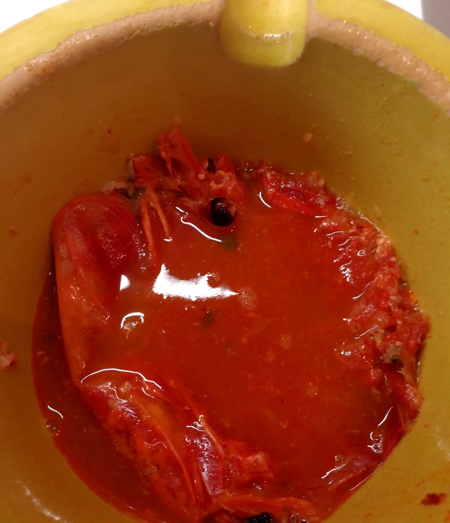Paso 5. Se sacan las cabezas de los carabineros, se machacan en el mortero para extraer toda su sustancia y sabor, a continuación se le añade un poco de caldo de las alubias y mediante un colador de cedazo se reintegra el jugo a la olla.