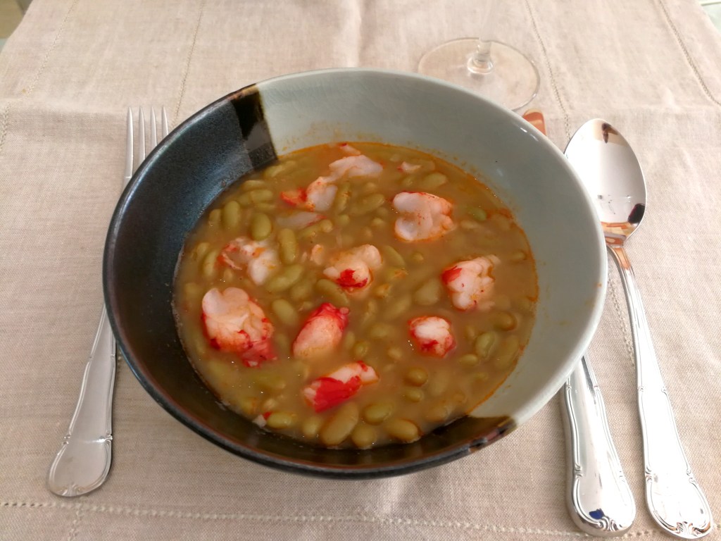 Paso 6. Se limpia de piel y se cortan en trozos las colas de los carabineros que se colocan encima del guiso de alubias verdinas ya emplatadas, dando un bonito contraste de color y potenciando el sabor del plato.