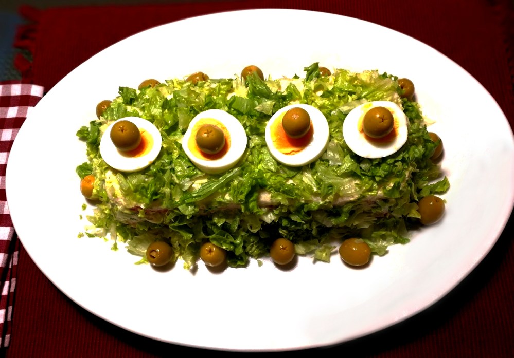 Paso 5. Cuando haya alcanzado el frío y la consistencia necesaria, sacamos el pastel del frigorífico, lo desmoldamos en una fuente y lo cubrimos con mayonesa seguidamente se adorna toda la superficie con su color verde.