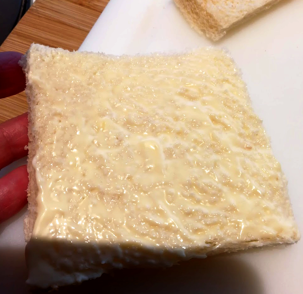 Paso 3. Cogemos las rebanadas de pan y se cortan los extremos para quitarles la corteza. Cubrimos el fondo del molde con el pan y ponemos una capa de tomate encima y después una de atún.