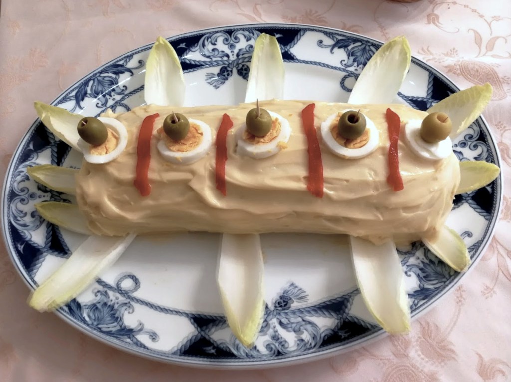 Paso 5. Para adornarlo se cortan los otros dos huevos duros en rodajas, el pimiento en tiras y las aceitunas. Se distribuyen artísticamente sobre el tronco cubierto de mayonesa dándole un aspecto apetitoso y estético.