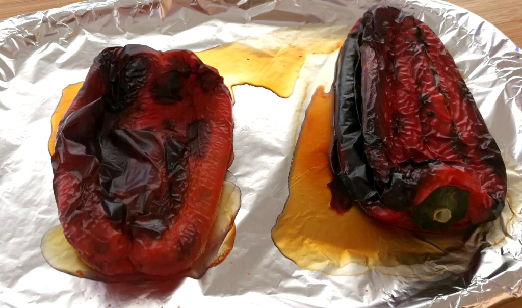 Paso 1. Se asan en el horno, los pimientos rojos. Cuando estén bien asados se les quita la piel y se cortan en tiritas.