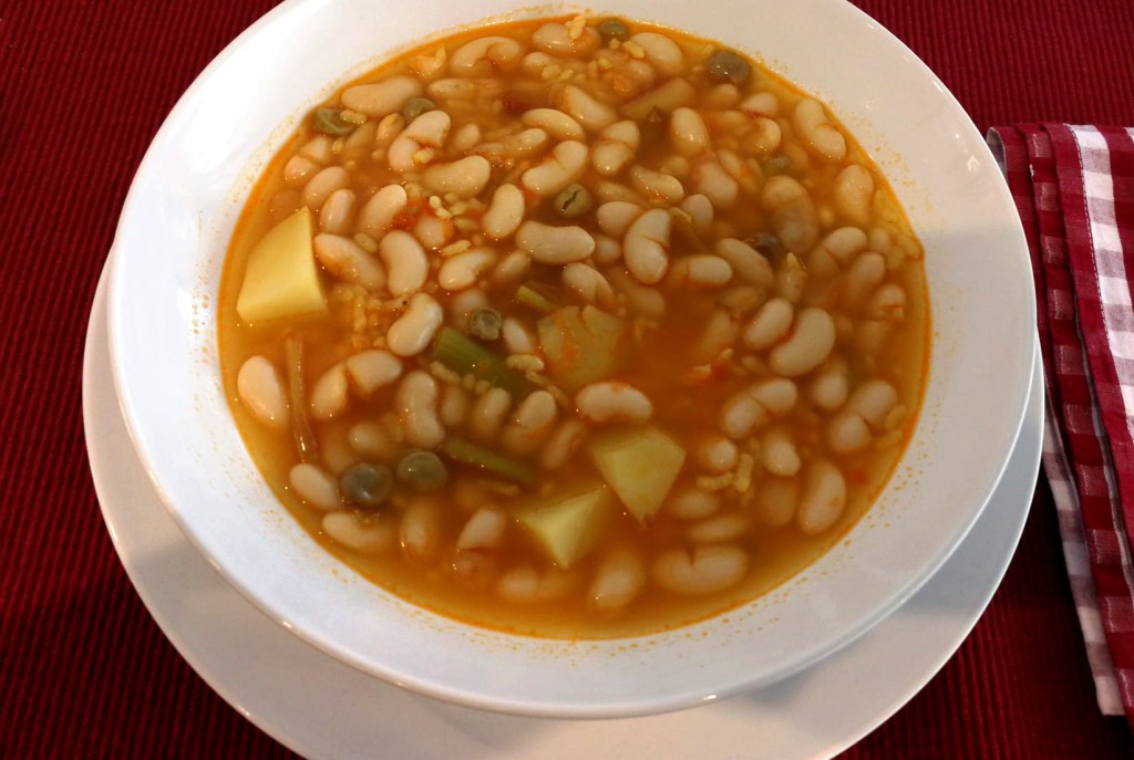 Paso 4. Este sofrito se incorpora a la olla donde están las alubias, y transcurrido un cierto tiempo, los ajetes, se dejan hervir durante unos 15 minutos, momento en que se ponen las patatas en trozos pequeños y el azafrán. 5 minutos después se le añade finalmente el arroz y se deja hervir todo el conjunto otros 15 minutos. Se comprueba la sal y el plato ya estará terminado y listo para servir.