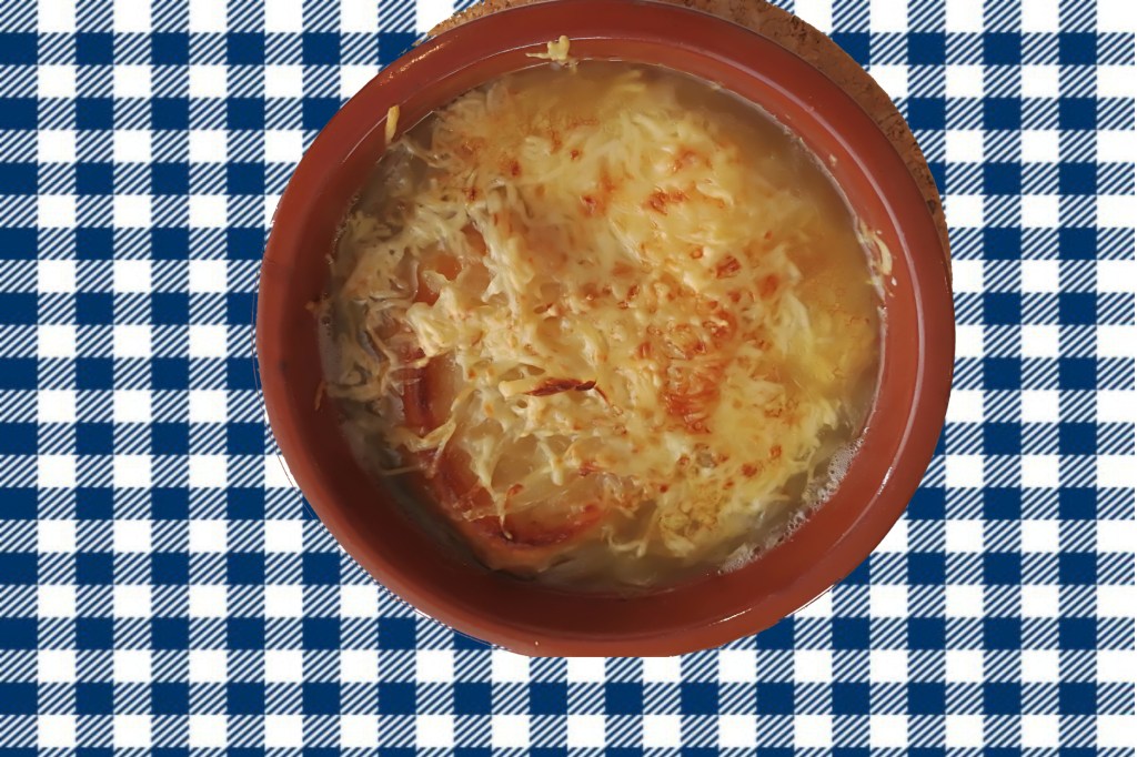 Paso 4. Se distribuye el caldo en cazuelas individuales, a ser posible de barro, con una tostada de pan y un huevo en cada una de ellas. Se espolvorea el queso rallado encima y se introduce al horno a gratinar durante 5-8 min hasta que el queso esté gratinado. En ese momento el plato estará listo para servir.