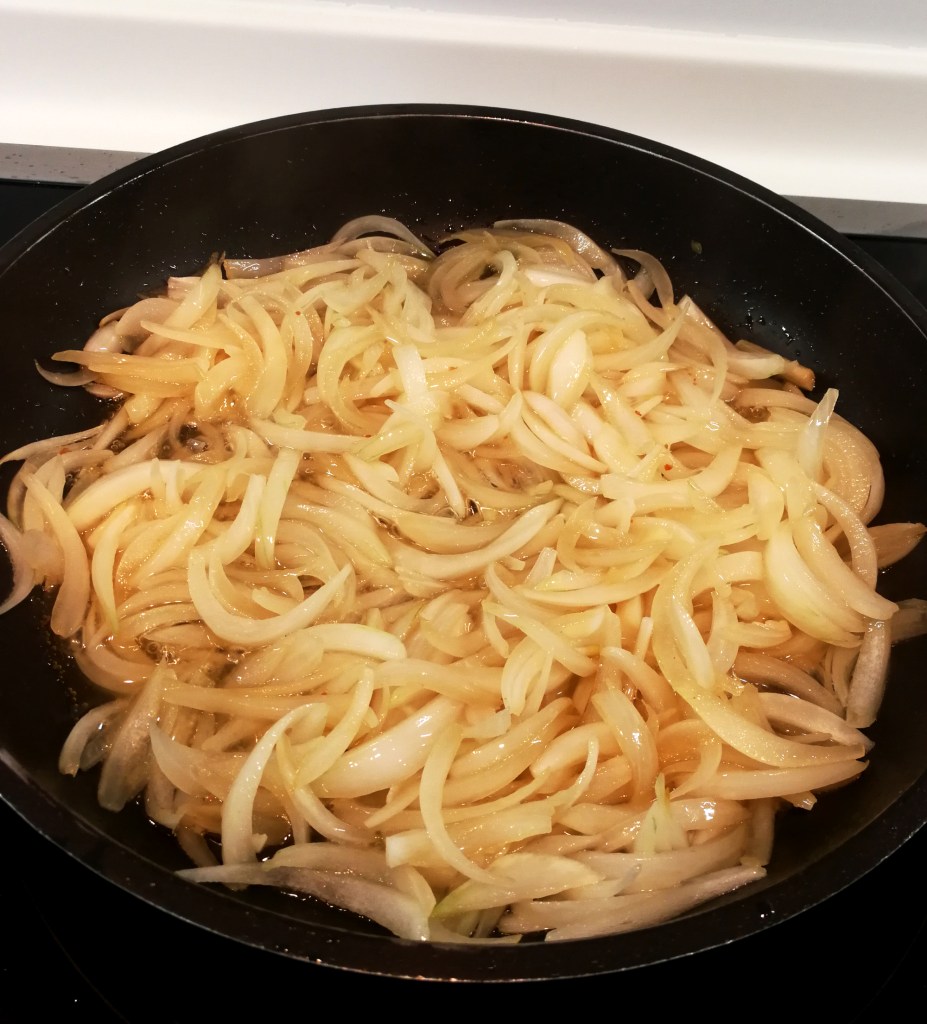 Paso 2. Se pone a pochar la cebolla que habremos cortado en «juliana», cuando esté lista se aparta del fuego y se añade el pimentón.