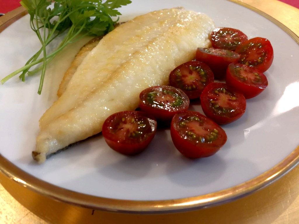 Paso 3. Se sella el lomo del rodaballo por ambos lados en la sartén con el fuego a intensidad fuerte. Se apartan los lomos y se ponen en una fuente para horno a la que se añade el aceite utilizado para freírlos y el vino blanco. Se introduce esta fuente en el horno una vez caliente y se hornea durante unos 10 a 15 minutos. Después de este tiempo la receta estará terminada y lista para emplatar.
