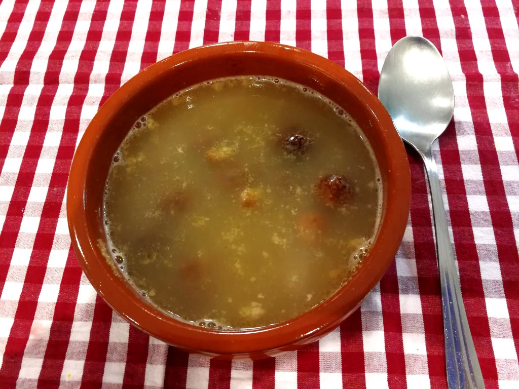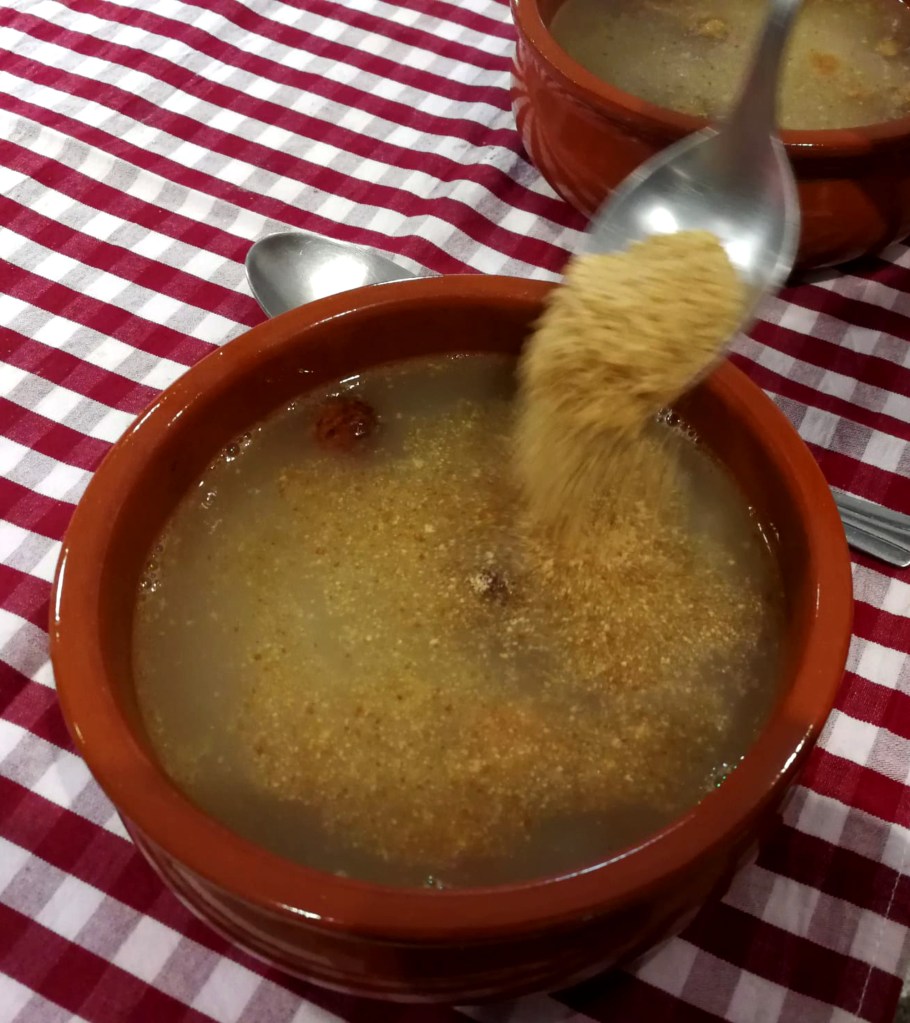 Se distribuye el caldo consomé colado dejando solamente incorporadas las pequeñas albóndigas, que se han separado del resto de la carne y se le añade la harina de pan tostado que previamente hemos fabricado y ya está listo para servir.