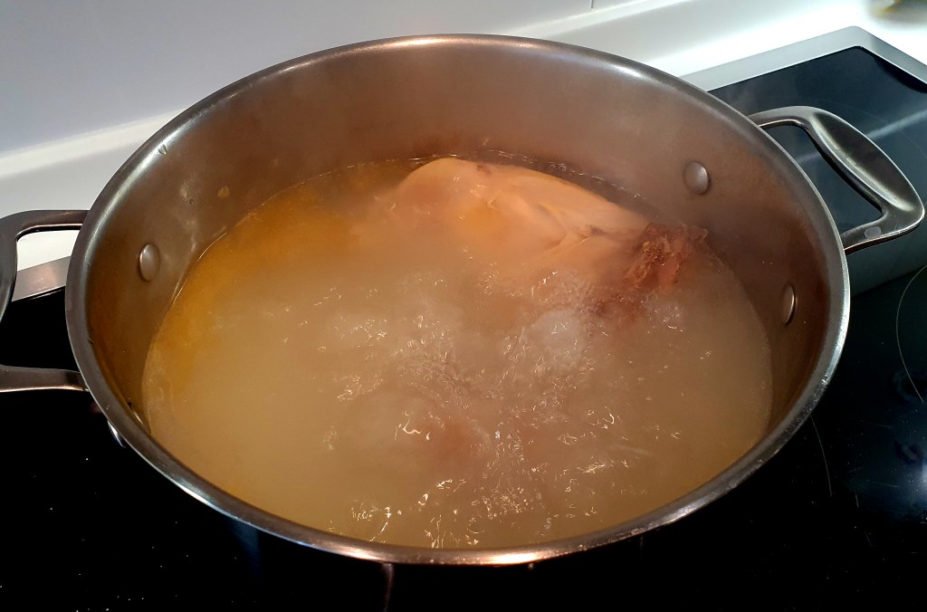 Se prepara una olla/cazuela con agua y sal, a la que se incorpora la gallina, el morcillo y el hueso(s) de jamón ibérico. Se deja cocer al «chup-Chup» durante unos 90 minutos, quitando la grasa superficial que pueda estar flotando durante la cocción.