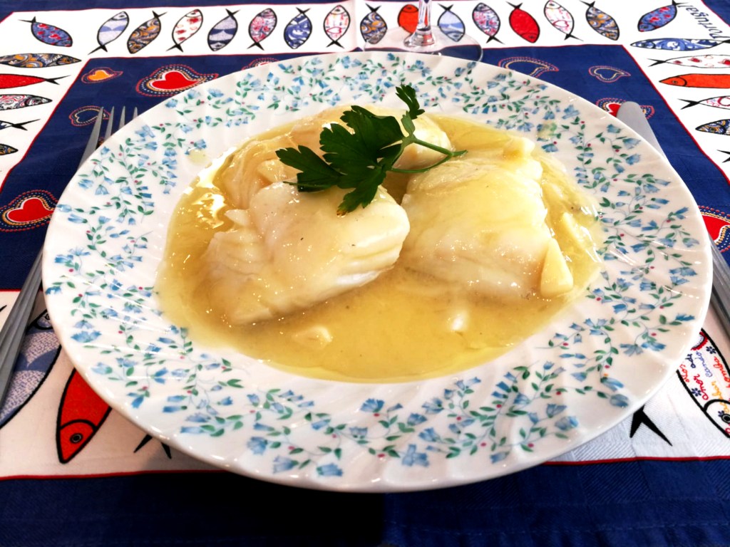 Nos permitimitimos recomendar un vino blanco Txacolí de Guetaria la variedad «Hondarrabi zuri» 100% que combina muy bien con la untuosidad del bacalao al pil pil.