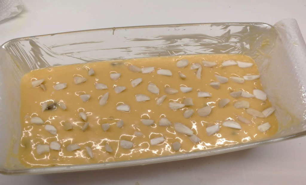 Aparte, se enharinan las frutas y las pasas, se añaden a la masa, se mezclan y se introducen en el molde. Por último se ponen encima las almendras troceadas y se introduce en el horno calentado a 180º C por un tiempo entre 45 y 60 minutos.