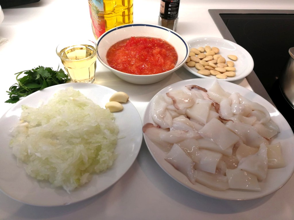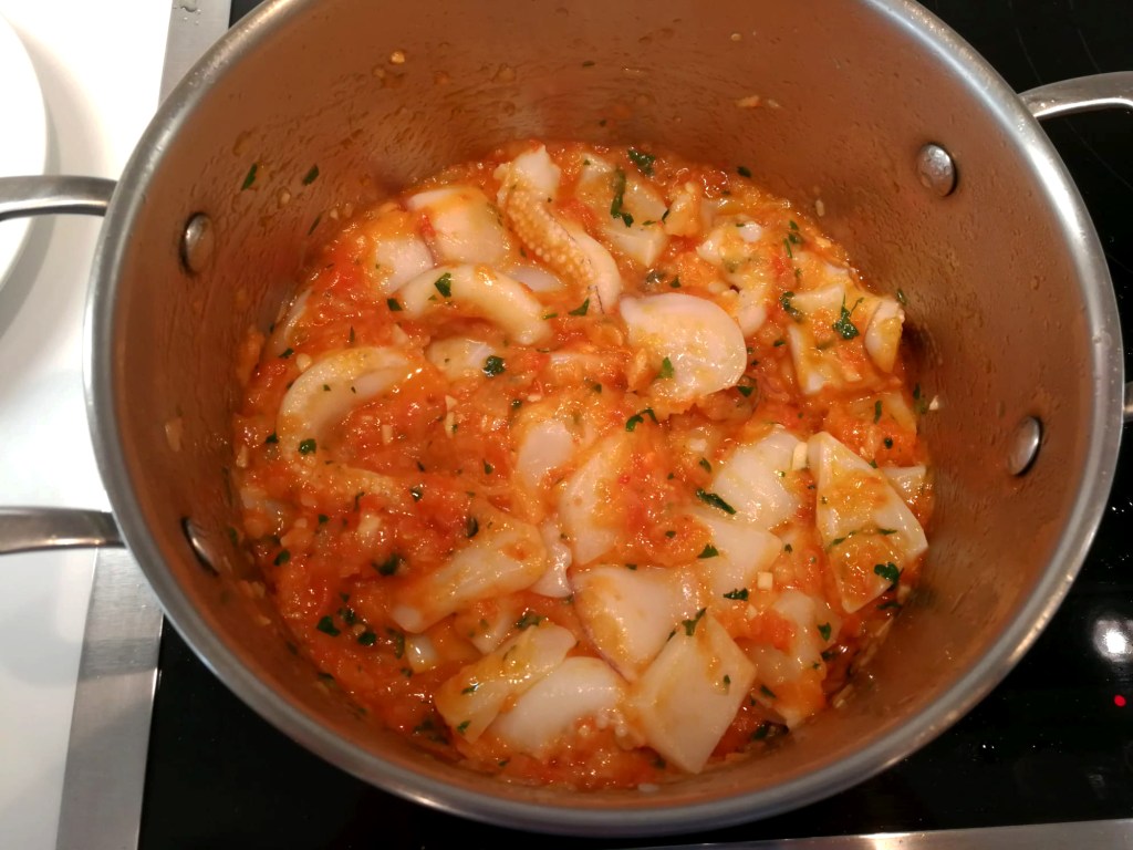 Se le añadirá la sepia, rehogándola con esta salsa, a continuación se le añade el vino que se dejará cocer durante unos 5 minutos, momento en el que se le pondrá una pizca de pimienta. En paralelo se habrá calentado medio litros de agua que se añadirá a la cazuela, que se tendrá hirviendo a fuego moderado durante alrededor de 1/2 hora o cuando la sepia esté blanda.