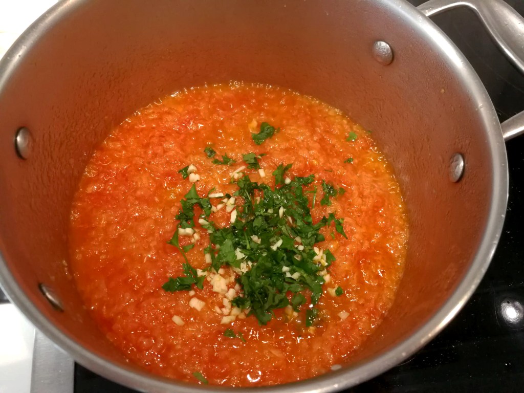 Se ralla la cebolla, se pocha en una cazuela con aceite y al poco tiempo se añadirán los tomates. Cuando esté el sofrito se le ponen los ajos picados y el perejil,