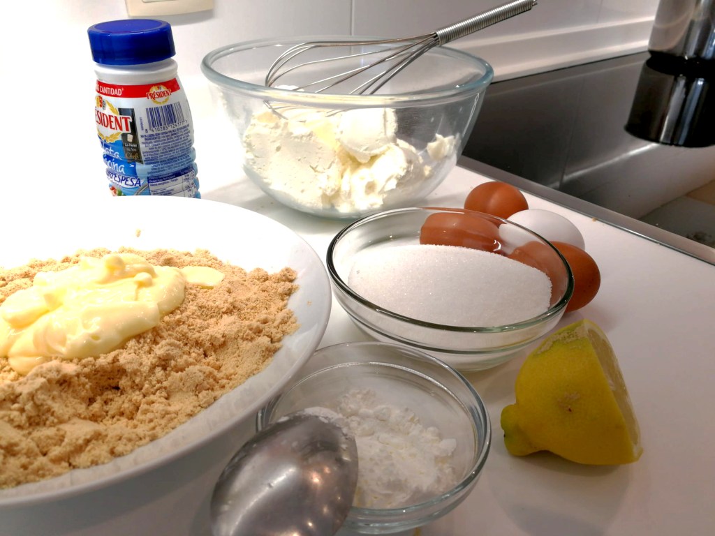 En el bol se pone el queso «Philadelphia», se añade el azúcar, se remueve bien y se añade la «crème fraîche » o la nata líquida. Opcionalmente se le puede añadir 200 gr. de queso «mascarpone», de ser así se reduciría en el mismo ramaje el otro queso. Se vuelve a remover y se añade el zumo de limón. A continuación se añade la «maizena» los huevos y la levadura, se mezcla todo y se pone en el molde encima de la base que hemos elaborado en el paso anterior.