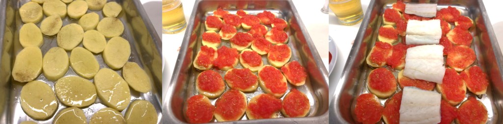 Se rallan los tomates y se ponen encima de las patatas, formando una segunda capa y a continuación se depositan los lomos de bacalao encima de las patatas con tomate de la parte central de la bandeja.