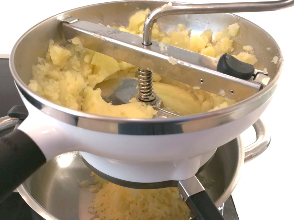 Se cuecen las patatas con algo de sal. Cuando estén blandas se les quita el agua y se pasan por el pasapurés.