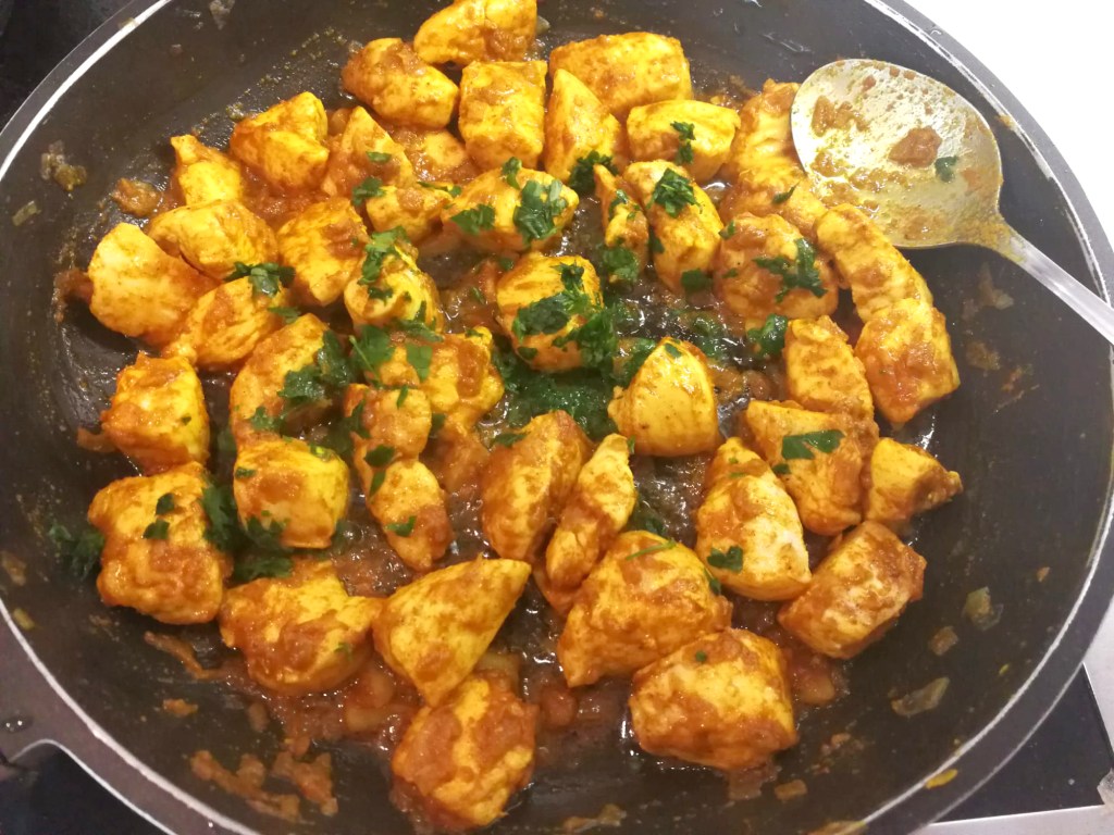 Se cortan las pechugas en dados y cuando la cebolla este mochada se añaden dándoles unas vueltas para sellarlas, a continuación se ponen las especias, removiendo para que no se peguen y se integren armoniosamente en el guiso.