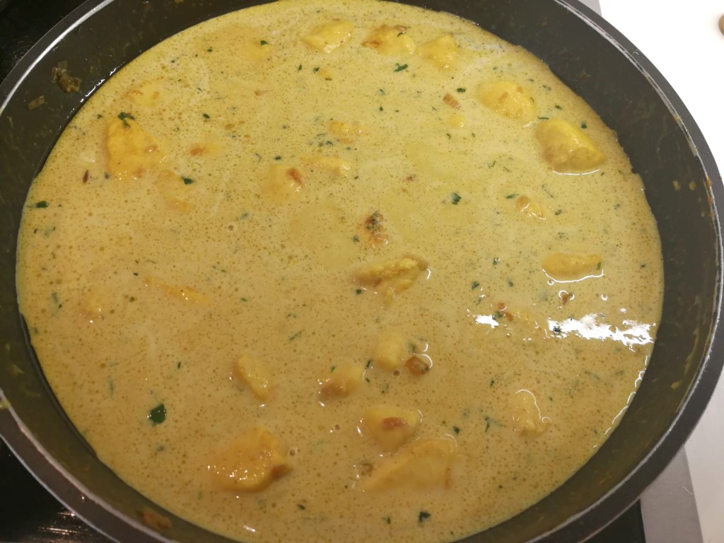 A continuación se añade la leche de coco y se deja hirviendo durante un rato, cuando la cocción está avanzada se pone el yogurt que se deja hervir otros 5 minutos, se prueba y se rectifica de sal si fuera necesario. Y ya se puede retirar del fuego para emplatar.