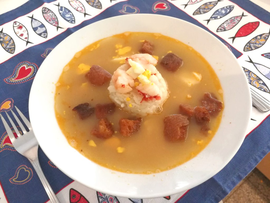 Se preparan los platos en los que se depositará el caldo con un pequeño «flan» de arroz (si se desea, aumentará la consistencia del plato, pero absorberá parte del sabor), se deposita un poco de carabinero cortado o gambas en cada plato, unas cucharaditas de huevo picado y unos dados de pan frito (opcionalmente unos trozos de rape si lo hemos incluido en nuestra receta). El conjunto se presenta al comensal. A continuación con una jarra se riega el conjunto hasta llenar el plato con el caldo de pescado o la misma operación se hace mediante una sopera y cucharón.