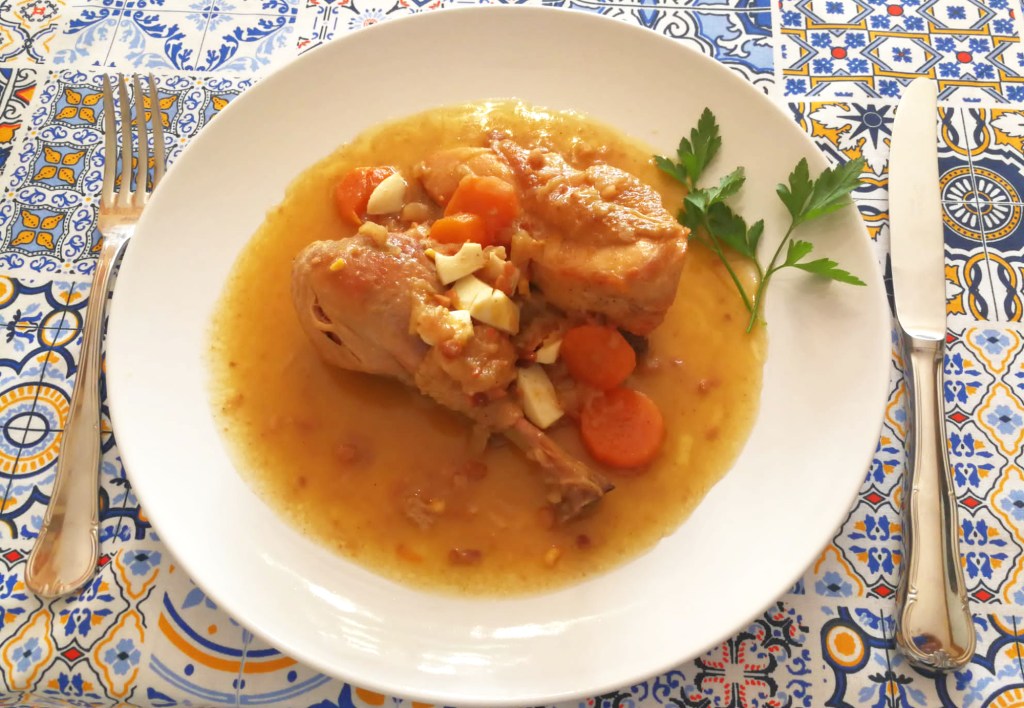 El el mismo aceite se ponen a pechar las cebollas cortadas en lonchas pequeñas, la zanahoria en rodajas y los ajos pelados enteros. Cuando esté en su punto se añade el pollo y seguidamente el vino que se tendrá unos minutos para que reduzca e impregne el pollo.