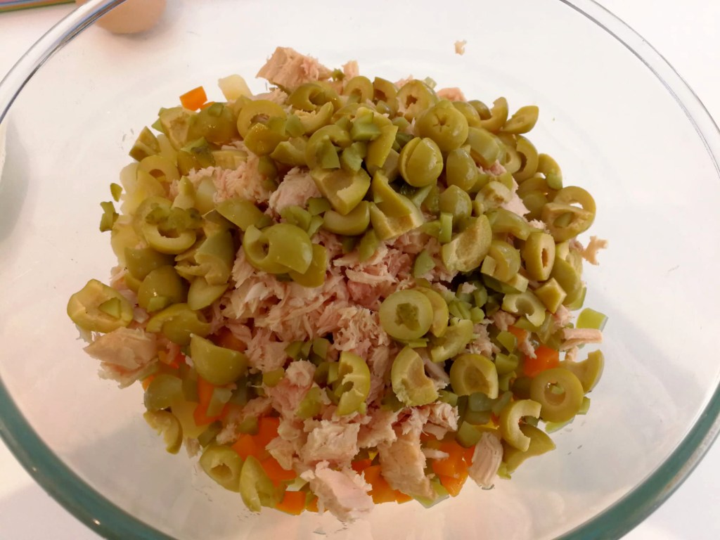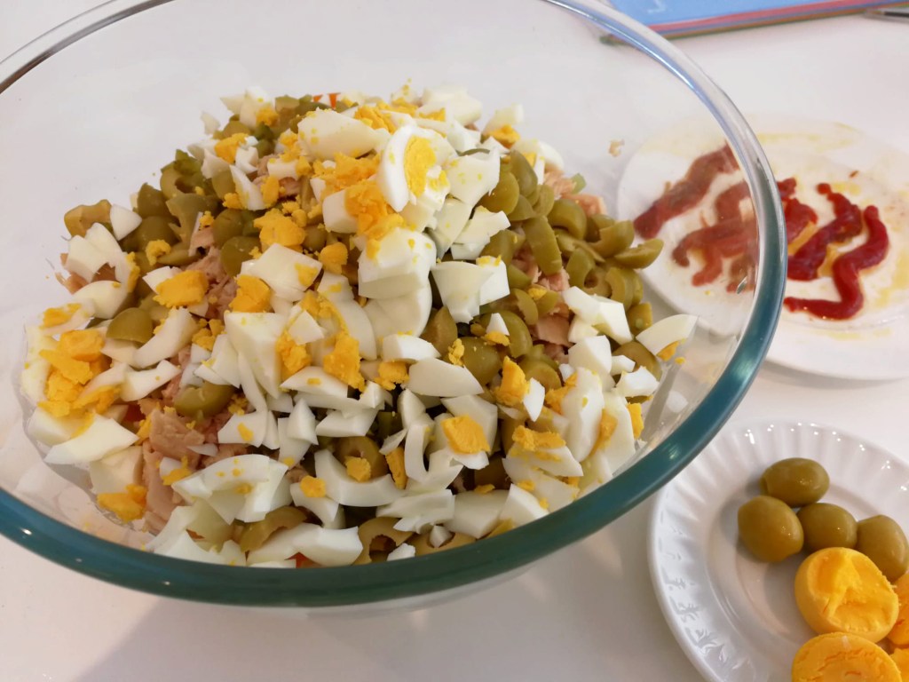 Una vez cocidas, se quita la piel a las patatas y se recortan también en trozos cuadrados muy pequeños. A continuación se ponen en un bol grande y se añade las verduras, el bonito troceado y las aceitunas asimismo troceadas. Pelamos los 3 huevos duros y separamos la yema de dos de ellos y la reservamos, el resto lo cortamos en trozos pequeños y lo unimos al resto de ingredientes que tenemos en el bol. Finalmente se le añaden los pepinillos también muy picadillos. Provamos la mezcla y la sazonamos con un poco de sal, con cuidado de no pasarse porque, las aceitunas y los pepinillos ya han aportado.