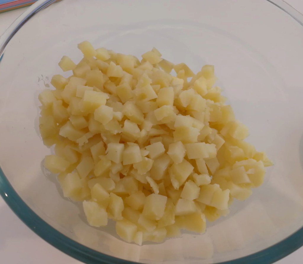 Se cuecen las patatas con piel durante 30 minutos y 3 huevos durante 12 minutos.