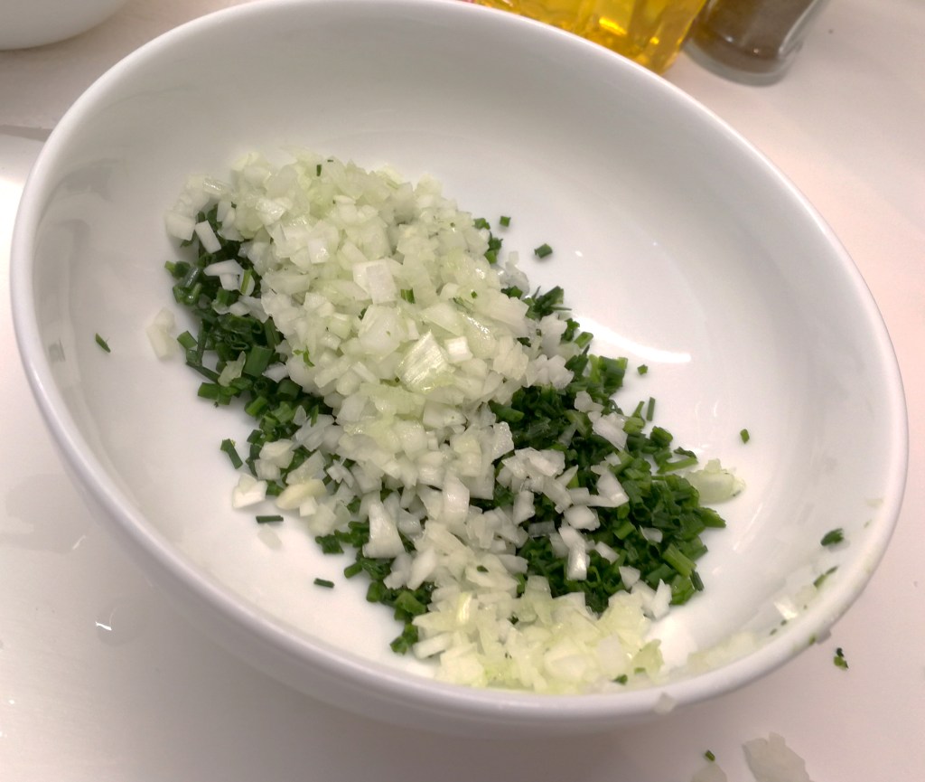 Para preparar la vinagreta (opcional) tostamos los piñones, pelamos los tomates, les quitamos las pepitas y los cortamos en daditos, picamos la cebolleta, el cebollino y mezclamos todos los ingredientes con aceite y el vinagre de Jerez.