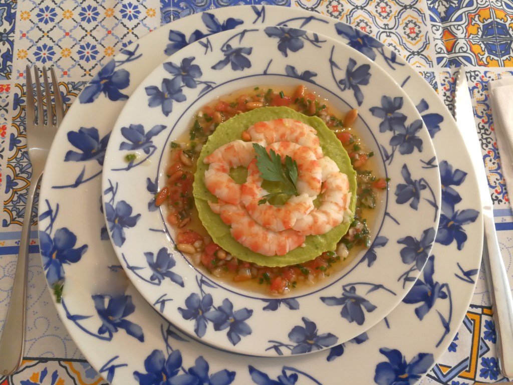 Con los langostinos dispuestos en forma de «corona», salteamos con la vinagreta todo el círculo alrededor de la corona y el plato queda ya presentado y listo para servir.