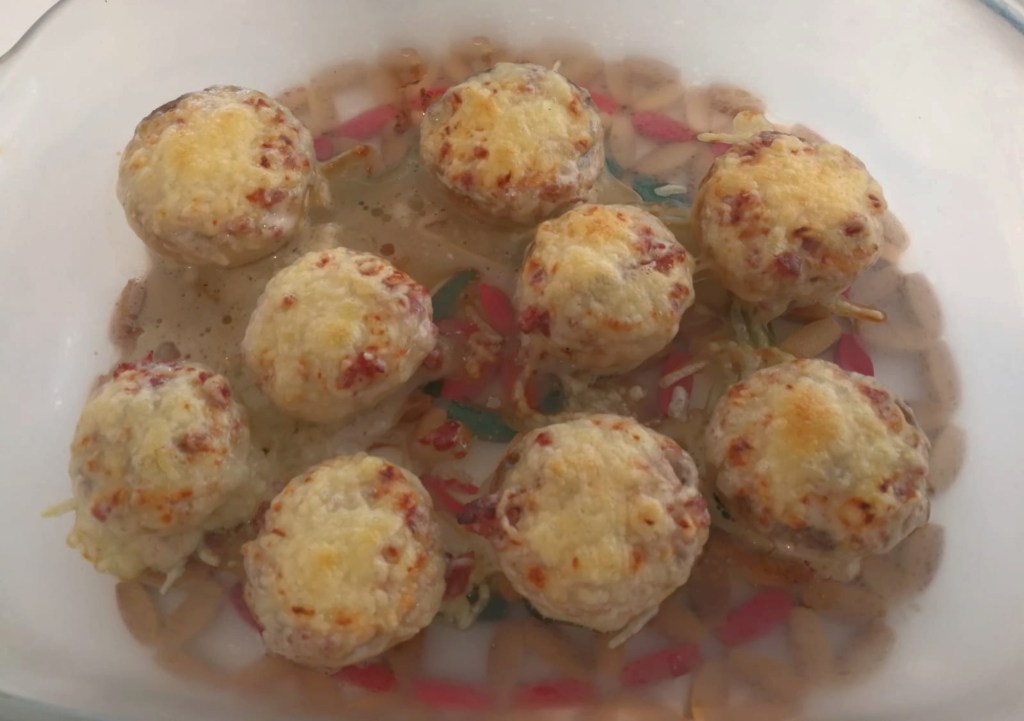 A continuación , en una fuente para horno, se colocan los champiñones y se rellenan con la salsa que hemos elaborado.