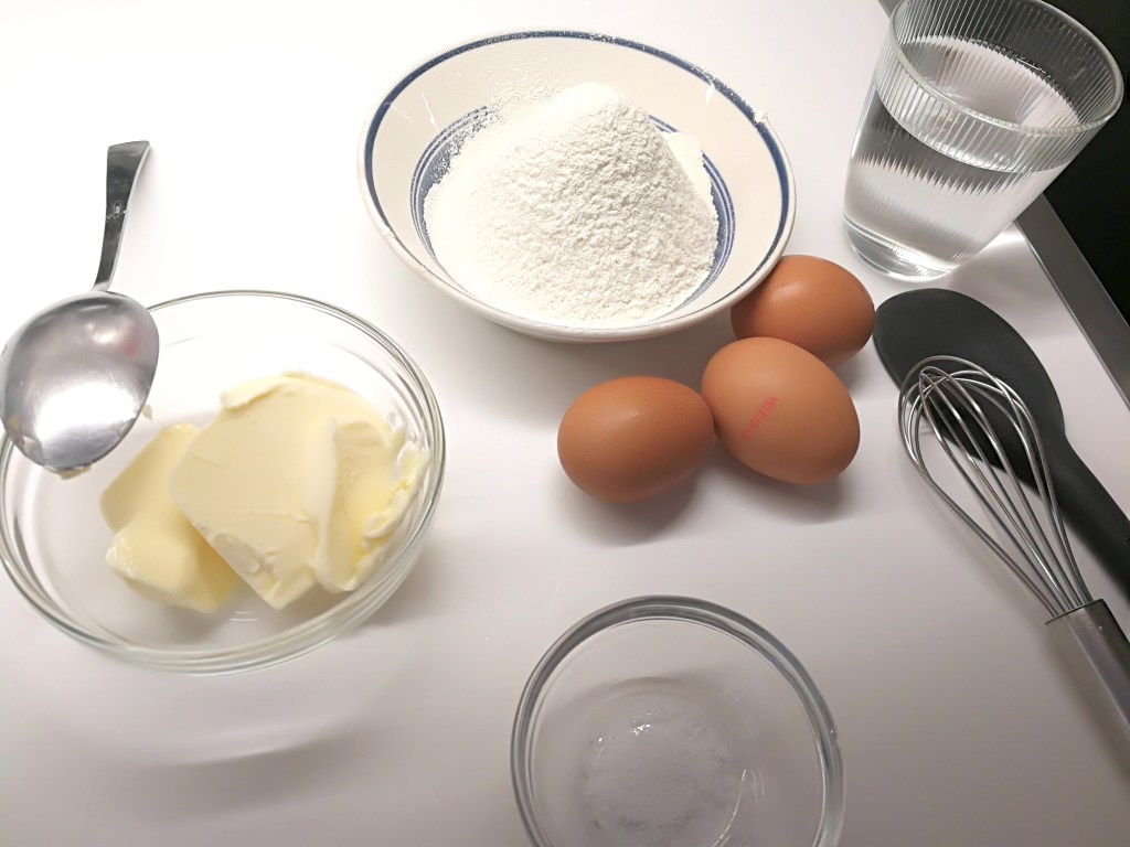 Poner el en fuego un cazo con el agua, la mantequilla y una pizca de sal. Remover a menudo con el fin de que se deshaga la mantequilla antes de que hierbal agua. Cuando arranque a hervir batir con el batidor (sólo unos segundos) y a continuación echar la harina de una vez, remover una vez enérgicamente con el batidor, terminando de remover con la espátula o cuchara de madera hasta el punto en que quede una pasta unida y compacta que se desprenda del cazo.