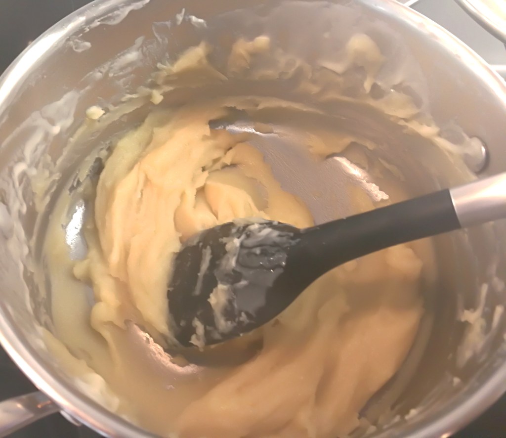 A continuación se retira del fuego y se añaden los huevos de uno en uno y nuevamente con una espátula o cuchara de madera, se trabajan hasta que la pasta vuelva a unirse. La pasta así elaborada ha de quedar «correosa» de forma que, al cogerla con la espátula y dejarla caer cueste desprenderse.