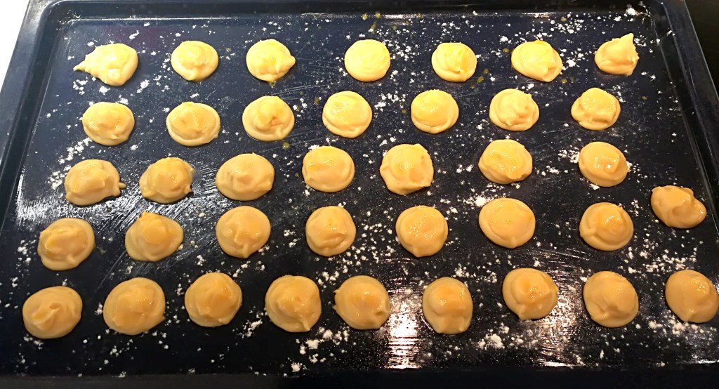 Estabilizada la pasta en el grado que hemos definido en el paso anterior, se introduce en una manga con boquilla lisa, de un cm aproximadamente. en la placa que previamente hemos engrasado se van poniendo pequeños montones de pasta que se pintan con huevo