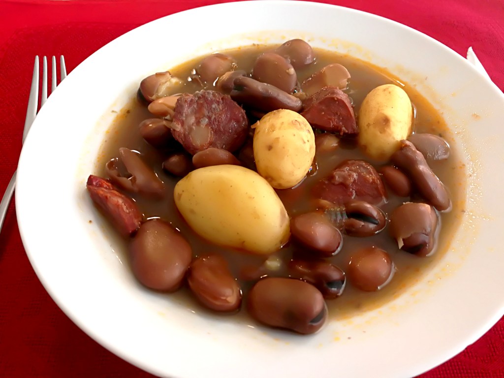 Cuando las habas «michirones» están tiernas se añaden las patatas lavadas conservando la piel y rectificamos la sal. Se dejan cocer hasta que las patatas estén en su punto para comer.