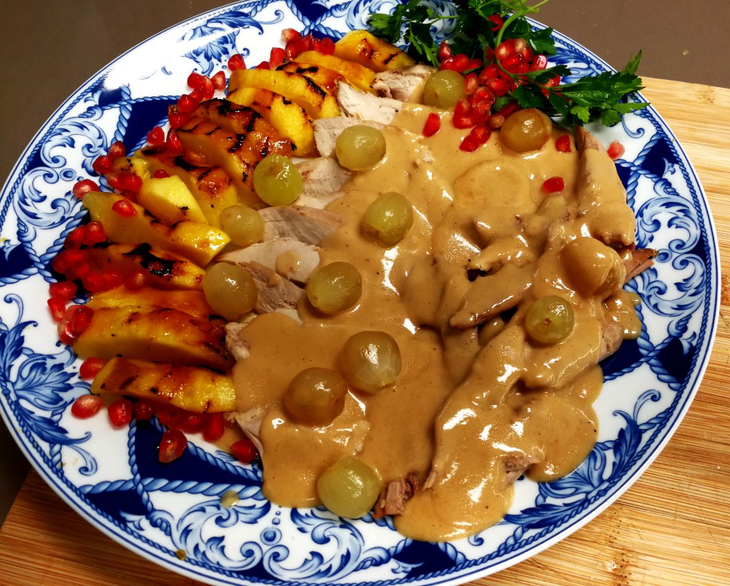 Con esta salsa se cubrirán los faisanes, los acompañaremos con manzanas braseadas y el resto de las uvas, previamente peladas y sin semillas, se utilizarán para decorar colocándolas alrededor del faisan. También podemos añadir unos granos de granada.