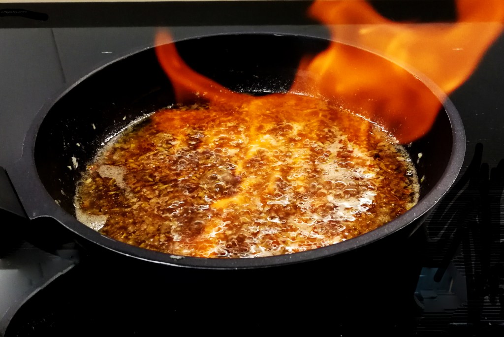 Ponemos la mantequilla con las chalotas picadas muy finas. Cuando estén doradas las chalotas, añadiremos el coñac, el oporto y lo flambeamos añadiendo a continuación el azúcar y la nata líquida. Dejamos que se reduzca a la mitad aproximadamente y añadimos 80 gramos de uvas trituradas y sin semilla, sazonamos de nuez moscada, y la salsa resultante la pasamos por el colador chino para que quede una salsa de textura fina y espesita.