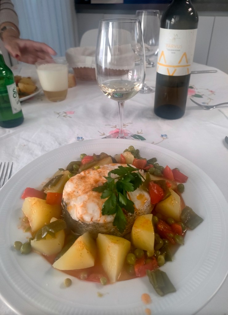 Se pelan y cortan las patatas que, en Galicia, se llaman «cachelos», se trocean los pimientos y se pelan los guisantes, de no haber naturales recomendamos elegir finos de la calidad «súmmum». se introducen en una bandeja de vidrio especial para horno y se cubren con el «fumet». A continuación se introducen en el horno y se asan . Antes de que estén acabadas de asar se le añaden las rodajas de merluza durante 10/12 minutos según tamaño.