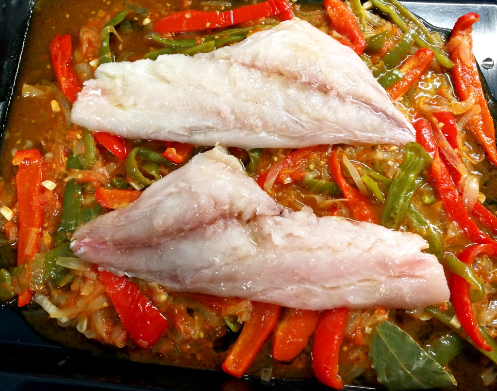 Encima se deposita la urta presentada en filetes* , salpimentada y con un chorizo de aceite por encima. A continuación se introduce en el horno a 180º C de 20 a 30 minutos. Y queda lista para emplatar y servir.