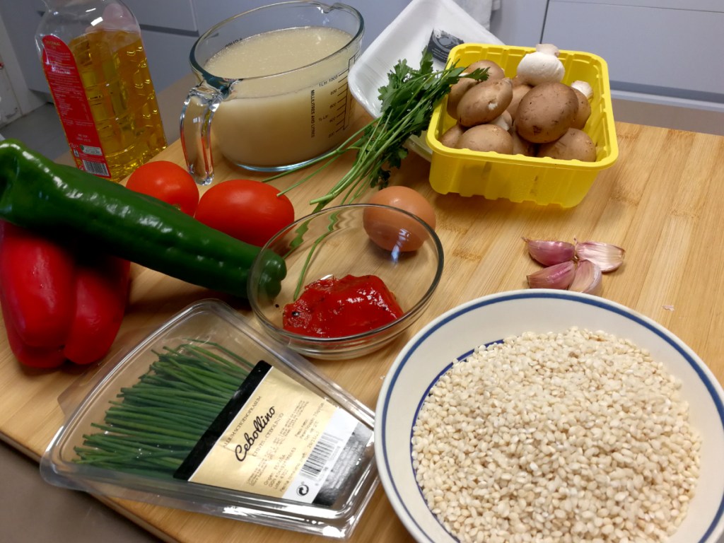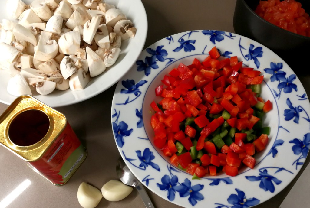 Mientras se rallan los tomates maduros, previamente lavados, . Se limpian de semillas y nervaduras los pimientos y se cortan en daditos pequeños. Se quita la tierra de las setas y se trocean en datos igualando el tamaño. Se pelan y pican los ajos.