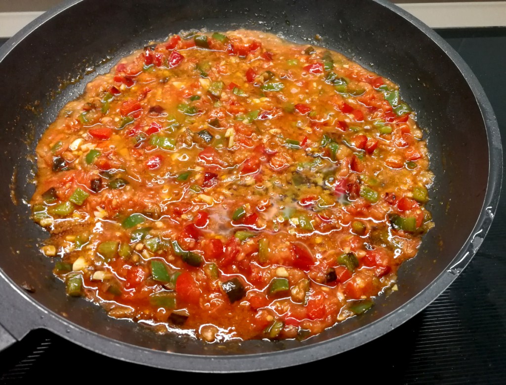 Se sofriéndonoslas los pimientos durante unos 5 minutos, momento en que se incorpora el ajo picado y el pimentón dulce y se mezcla bien. A continuación se añade el tomate rallado y se deja mochar hasta que evapore el agua que suelta.