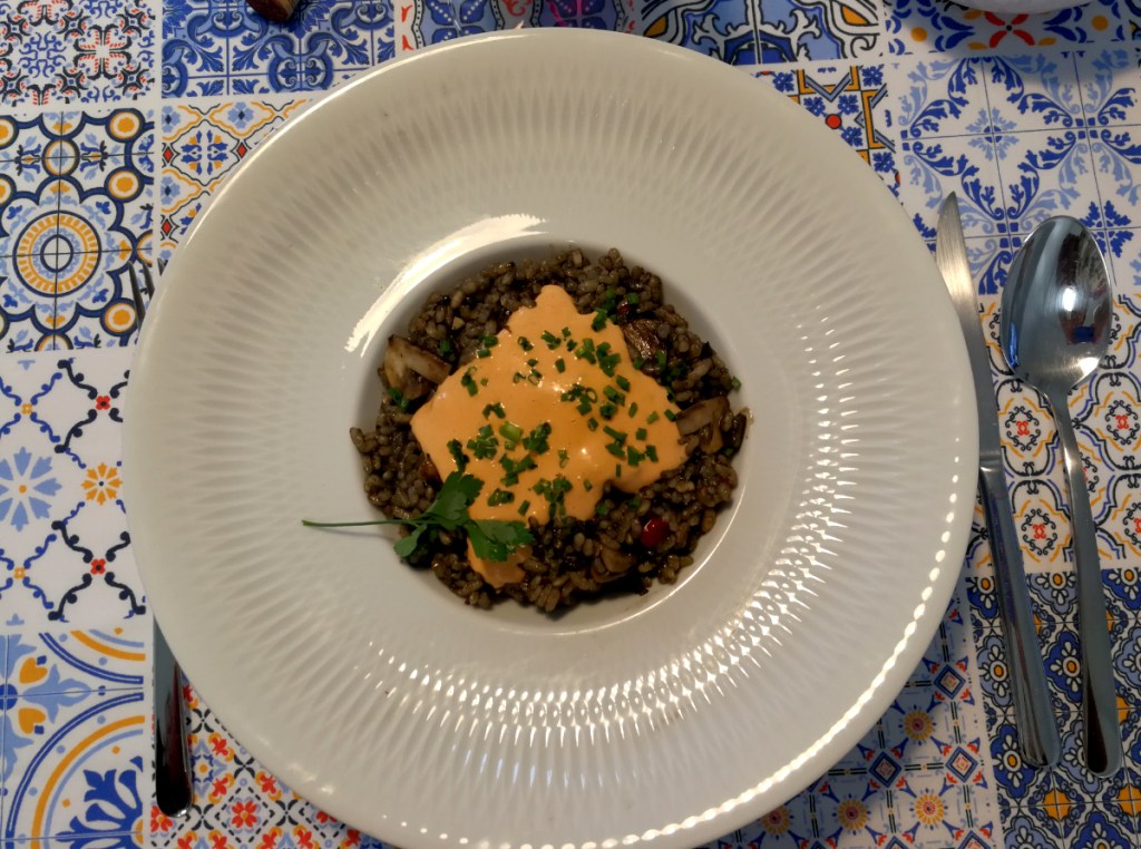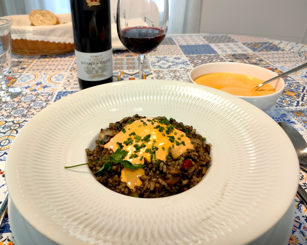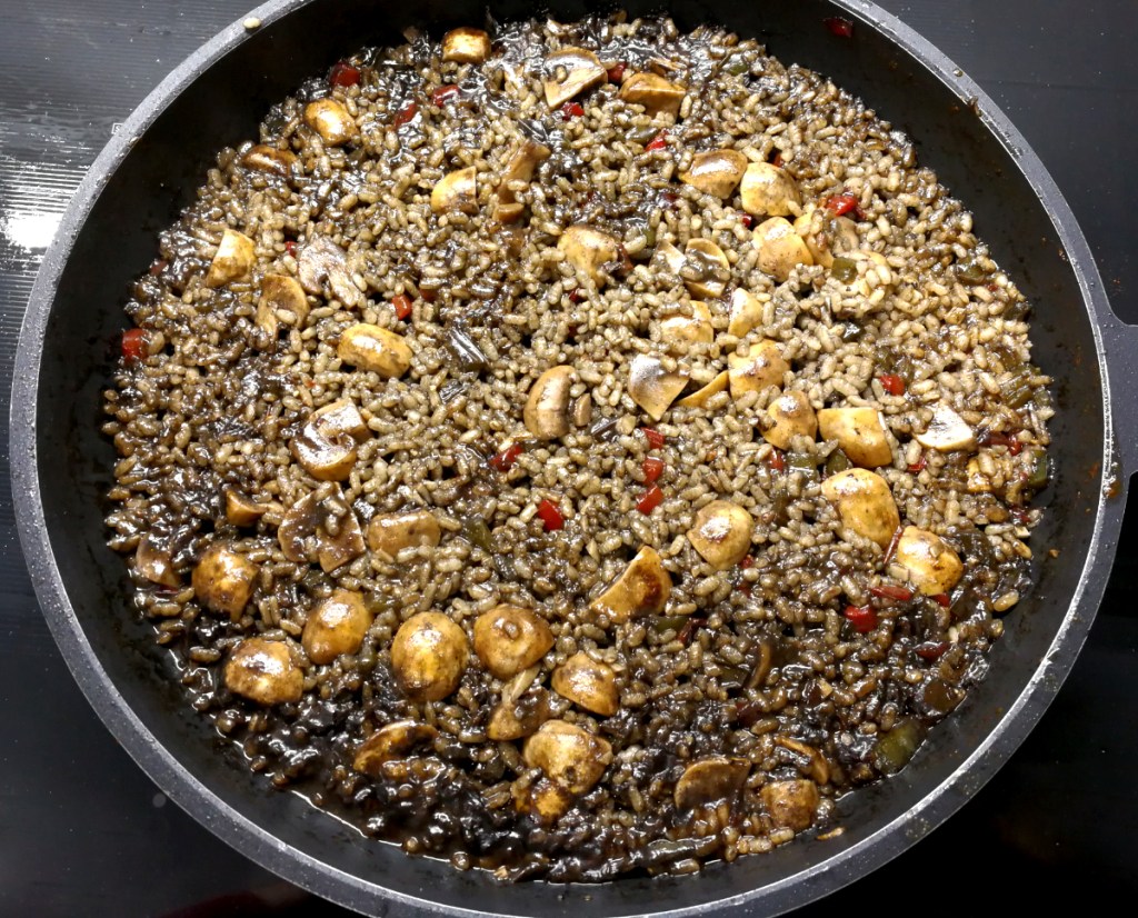 Se agrega el arroz y se sazona ligeramente, a continuación se añade la tinta del calamar y las setas, se mezcla bien y se añade el caldo caliente. Se inicia a fuego fuerte para cuando arranque el hervor bajarlo a fuego medio. Sin remover, se deja cocer hasta que absorbe todo el caldo, (unos 18 minutos). Se aparta del fuego y se deja reposar unos minutos.
